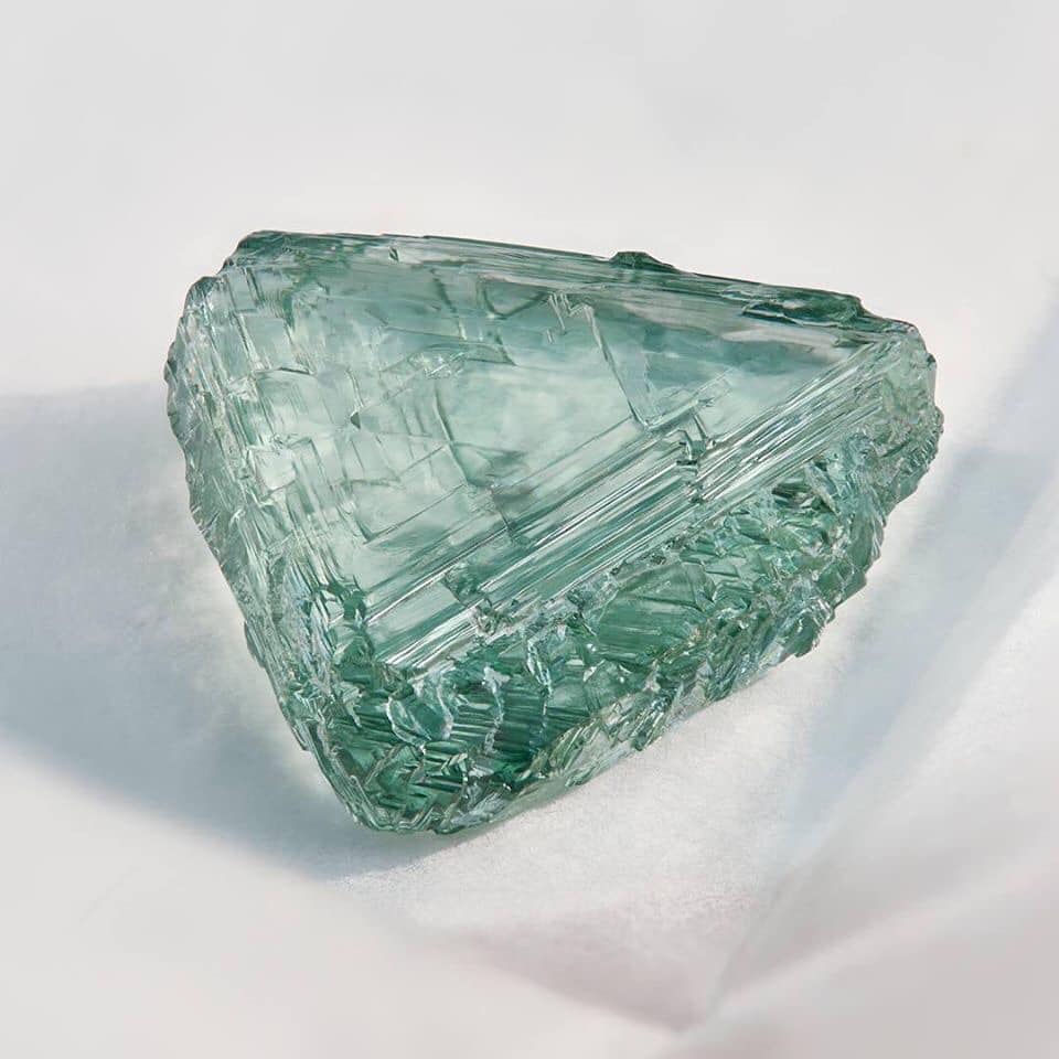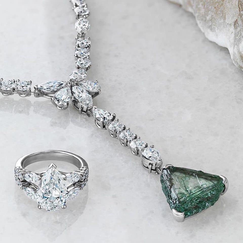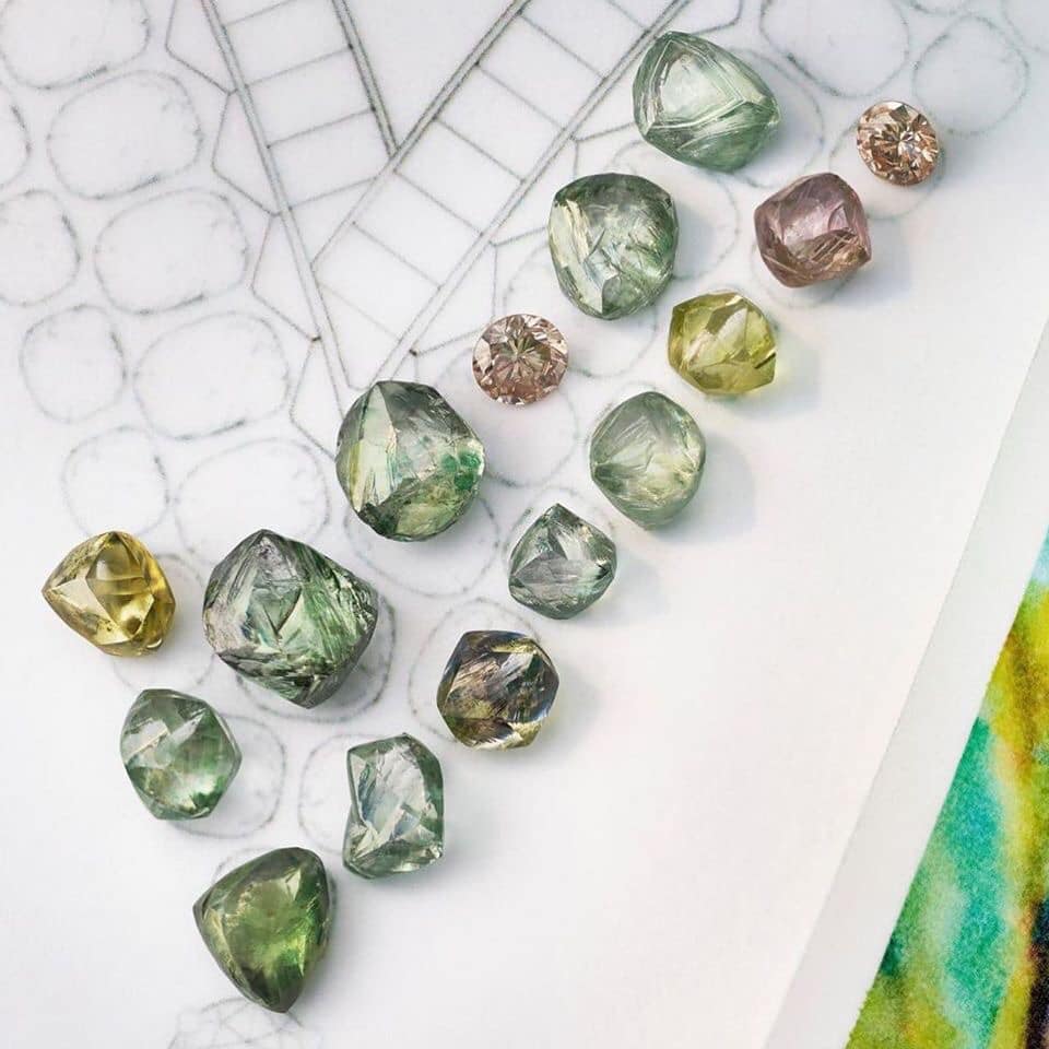 Un grupo de diamantes de colores naturales; 18.79 quilates macle de diamantes de color verde azulado presentado en el Collar del Loto del Despertar @DeBeersJewelers